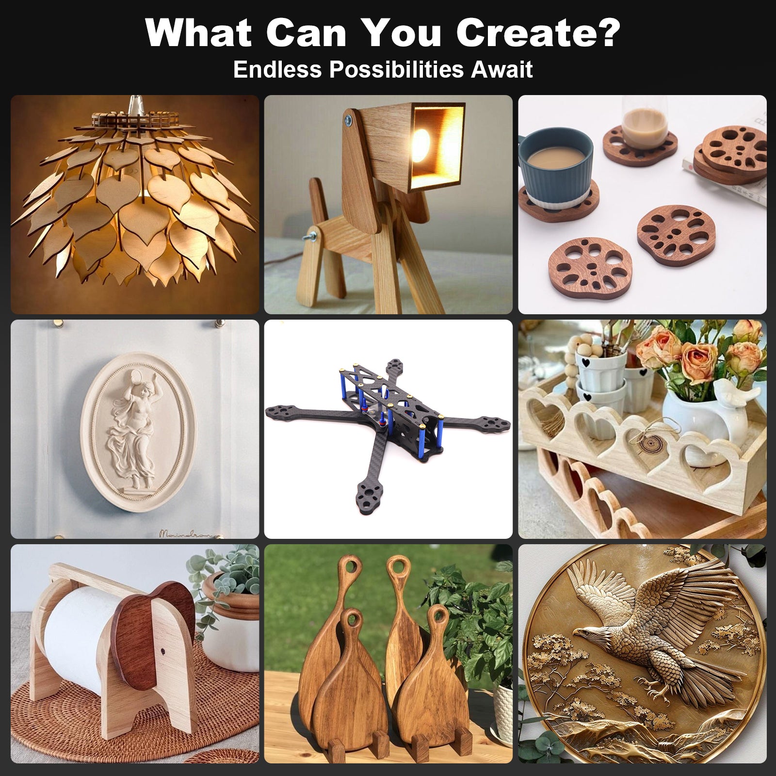 Plywood/MDF/Solid wood/Acrylic/Carbon fiber/Aluminum/Copper/Stainless steel